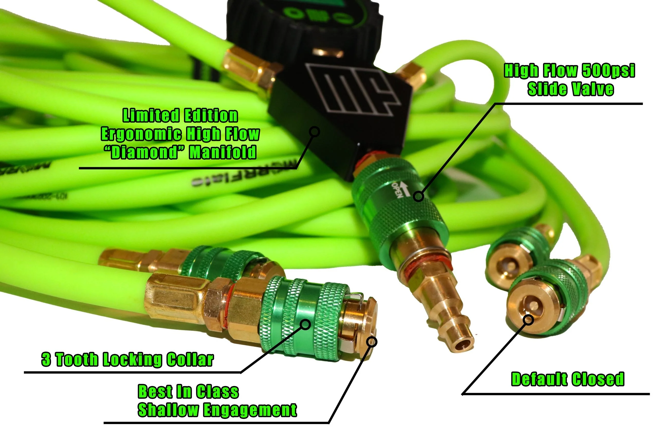 – Check all of the tires’ PSI from the manifold (No more continuously bending over checking PSIs)